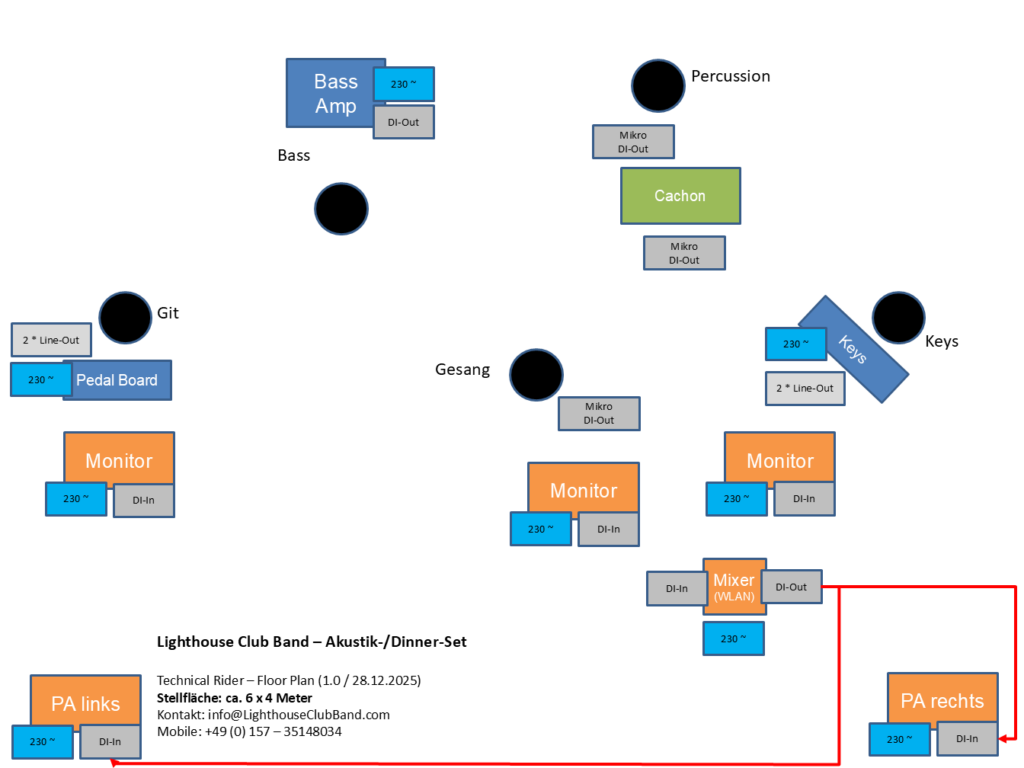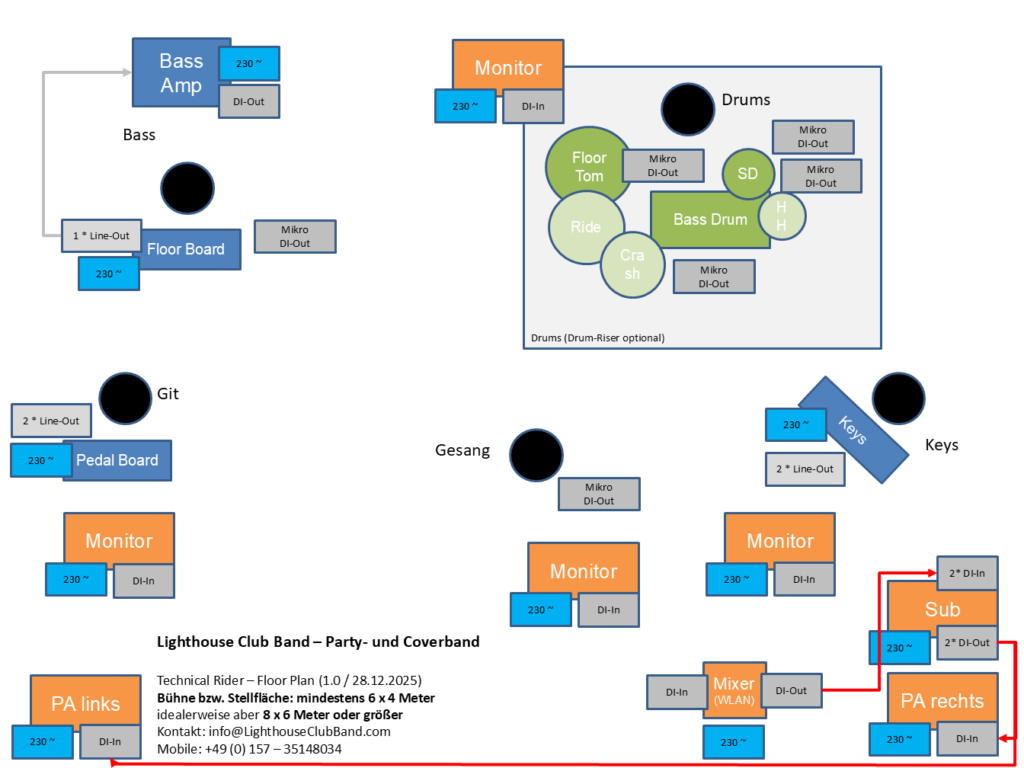 Klein, aber fein! Eine Fläche von mindestens 6 × 4 Metern idealerweise aber 8 x 6 Meter oder größer. Wenn mehr Platz vorhanden ist – umso besser für Show, Licht und Bewegung. Mehr Infos findet ihr in unserem Aufbauplan bzw. Stage-Rider (PDF-Datei zum Download) für die Cover- und Partyband bzw. Akustik-/Dinner-Set.