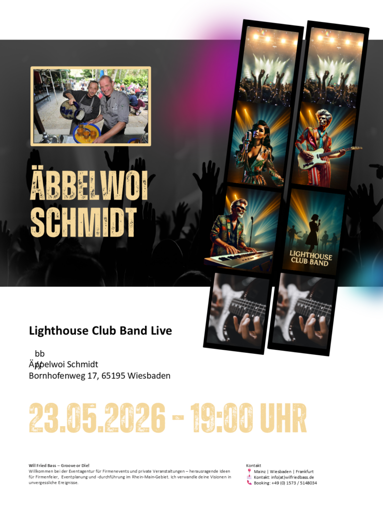 Wenn gute Musik auf echten Äbbelwoi trifft, entsteht genau die Stimmung, die man nicht planen kann – nur erleben. Die Lighthouse Club Band sorgt mit grooviger Livemusik für einen Abend voller Energie, Mitsingen und guter Laune. Authentisch, handgemacht und perfekt für einen geselligen Abend in Wiesbaden.